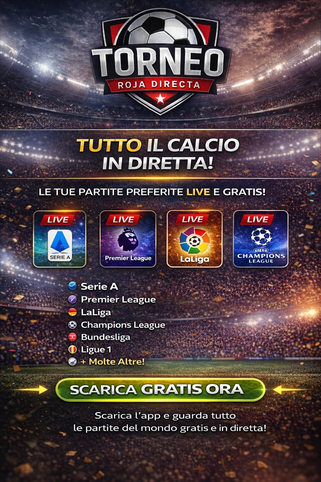 Roja Directa TV è la migliore app per guardare calcio live e sport in streaming. Guarda tutte le partite in HD, senza abbonamento e senza pubblicità invasive. Disponibile su tutti i dispositivi Android, con aggiornamenti continui e nuovi canali ogni settimana.